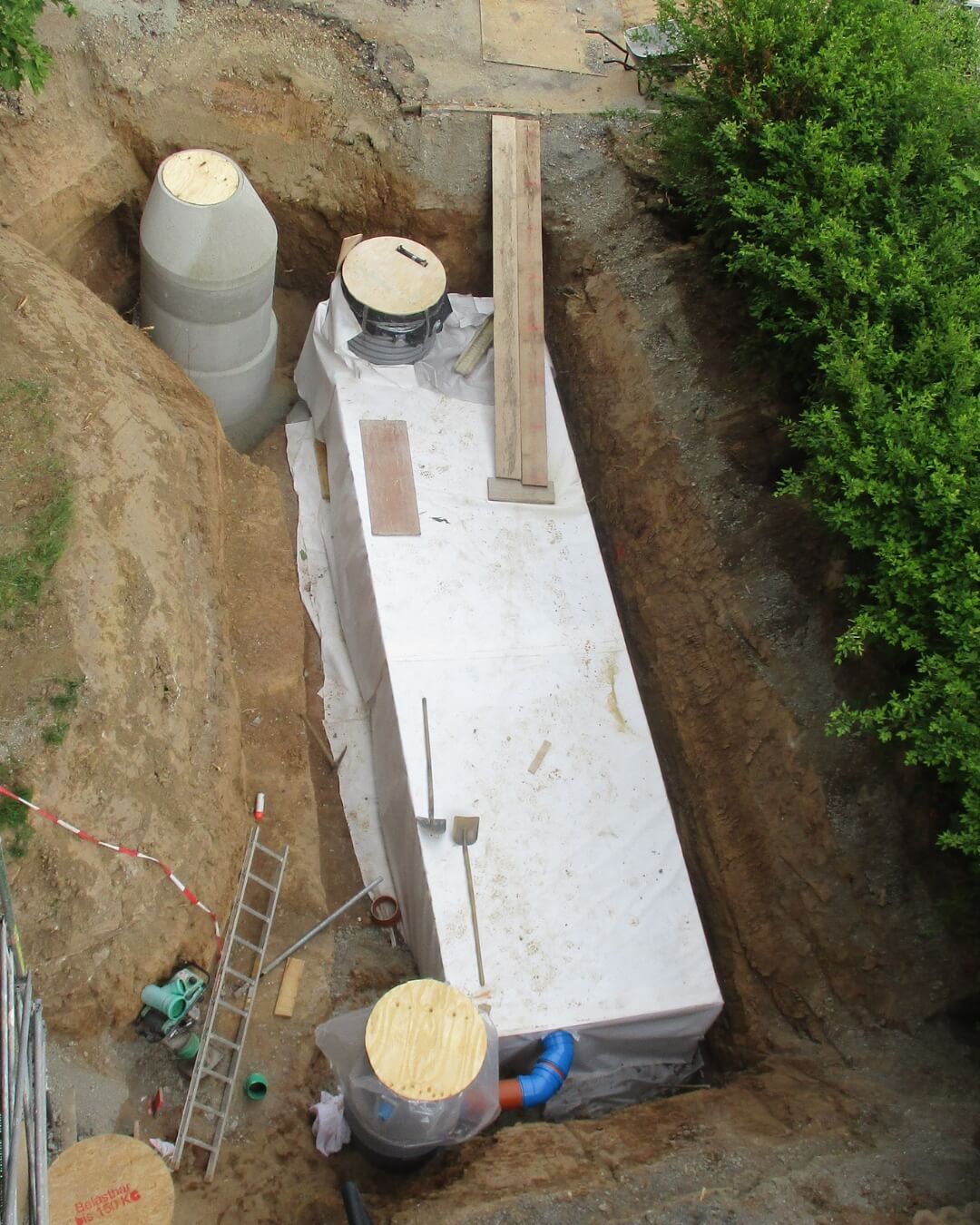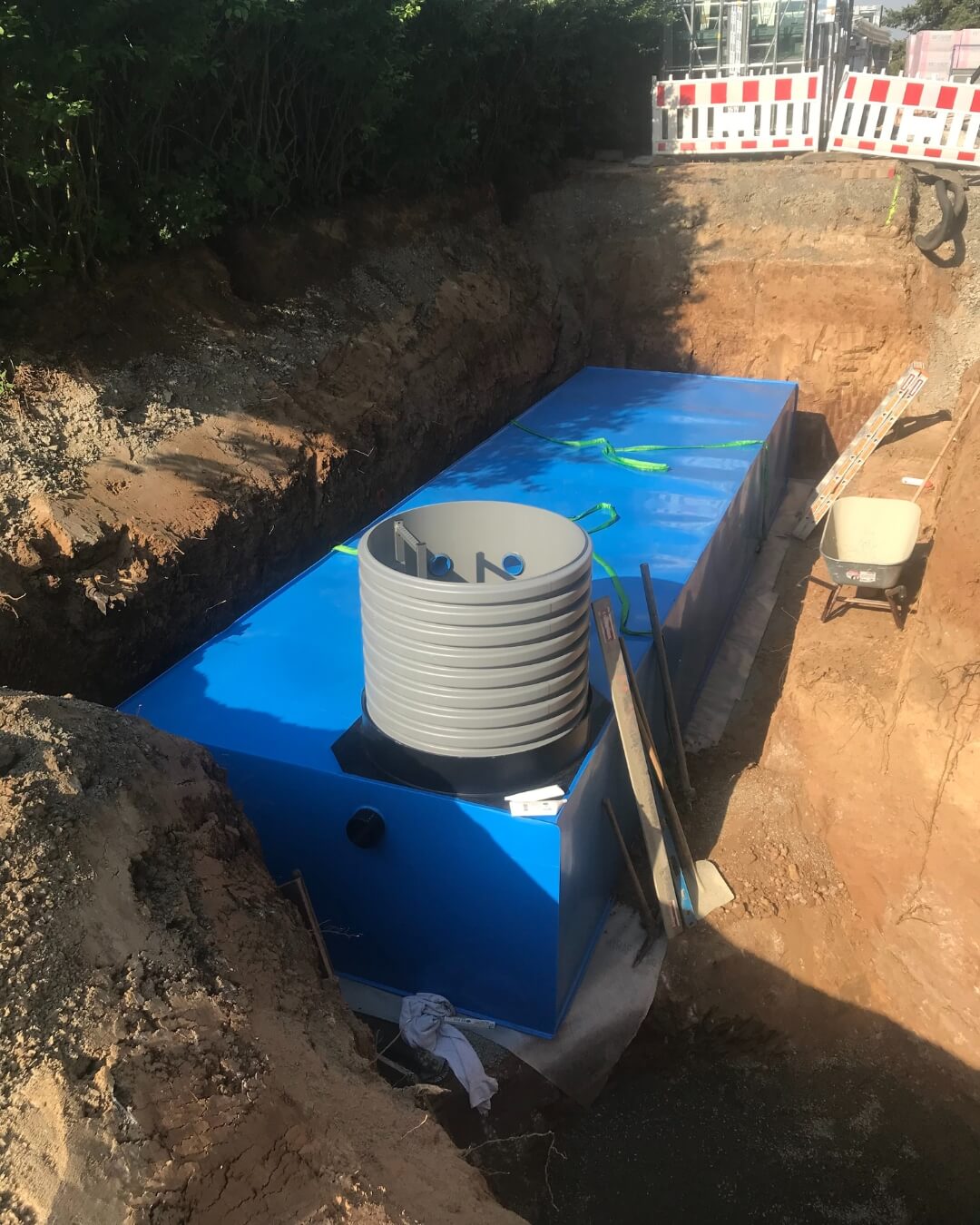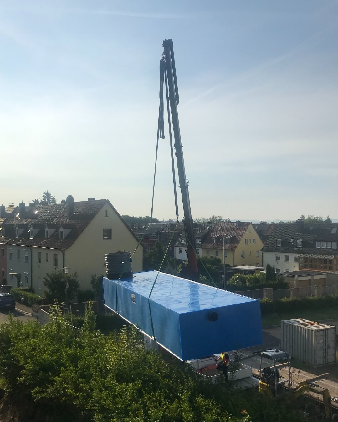 In Schweinfurt geht es ordentlich voran! Unter anderem haben wir hier vor kurzem eine Zisterne des Typs KS-BlueBox inklusive Reinigungsschacht eingebaut und diese über einen Betonschacht mit dem Bestandskanal verbunden. Aufgrund der Gegebenheiten vor Ort und des bestehenden Baumbestands musste die Zisterne vom Nachbarsgrundstück eigehoben werden.