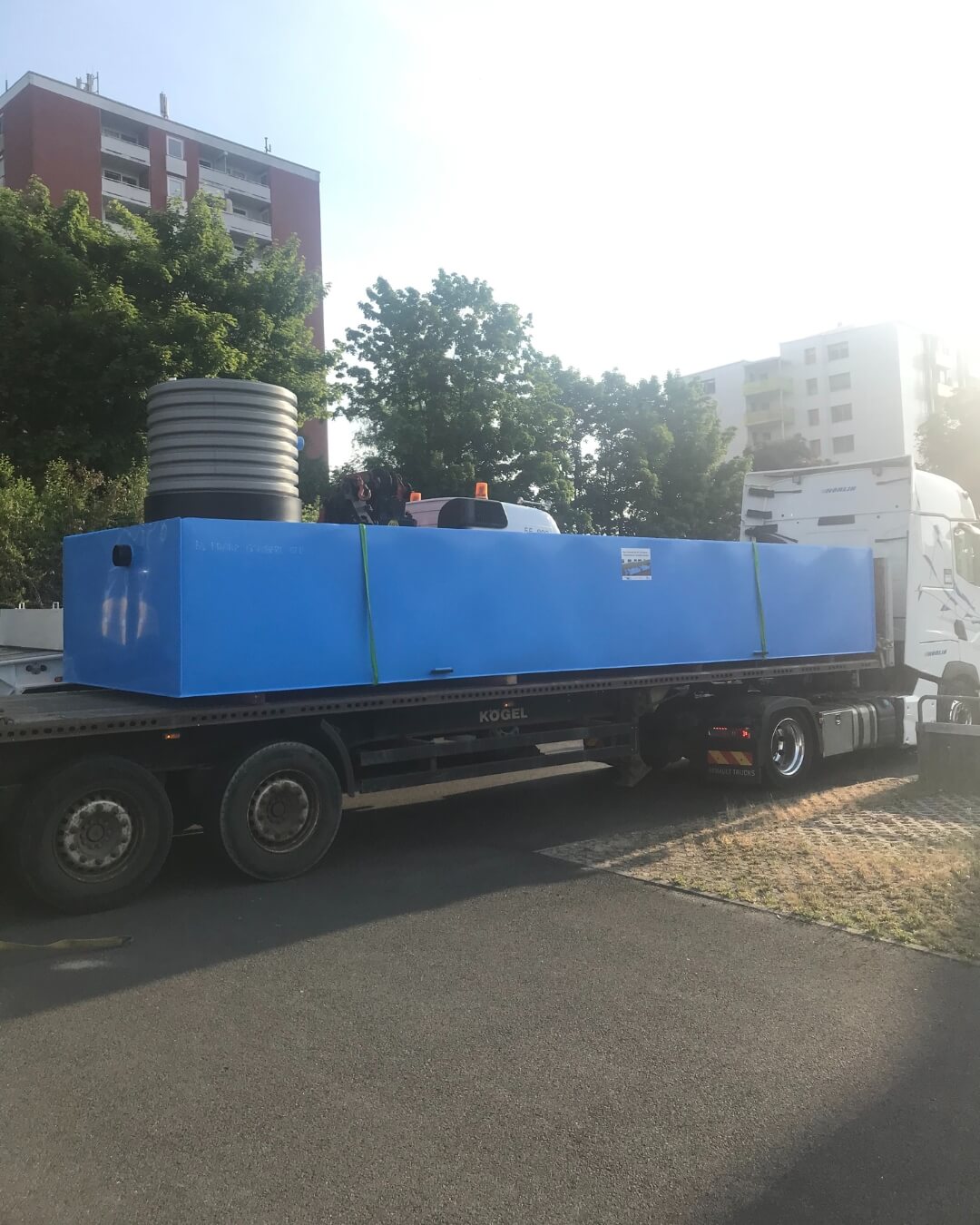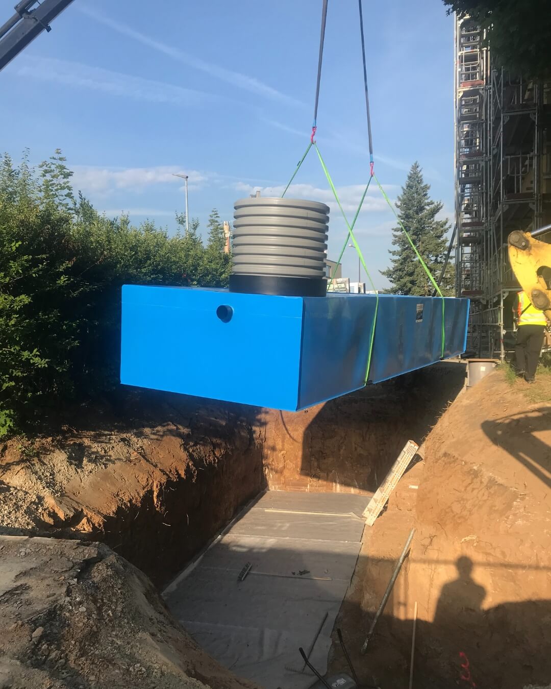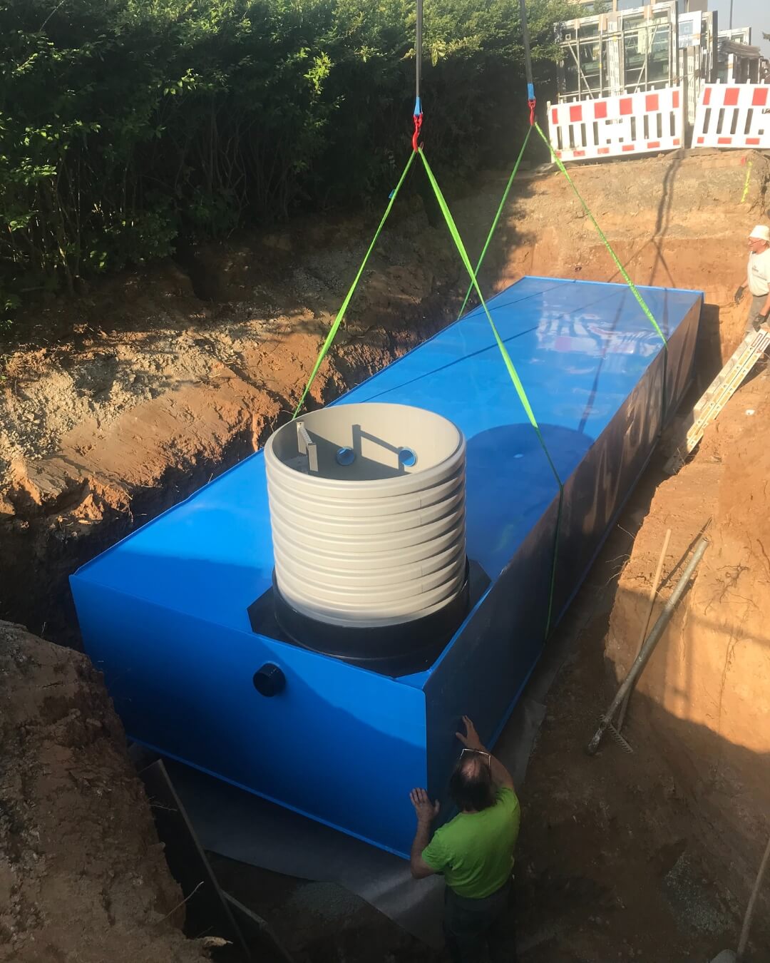 In Schweinfurt geht es ordentlich voran! Unter anderem haben wir hier vor kurzem eine Zisterne des Typs KS-BlueBox inklusive Reinigungsschacht eingebaut und diese über einen Betonschacht mit dem Bestandskanal verbunden. Aufgrund der Gegebenheiten vor Ort und des bestehenden Baumbestands musste die Zisterne vom Nachbarsgrundstück eigehoben werden.