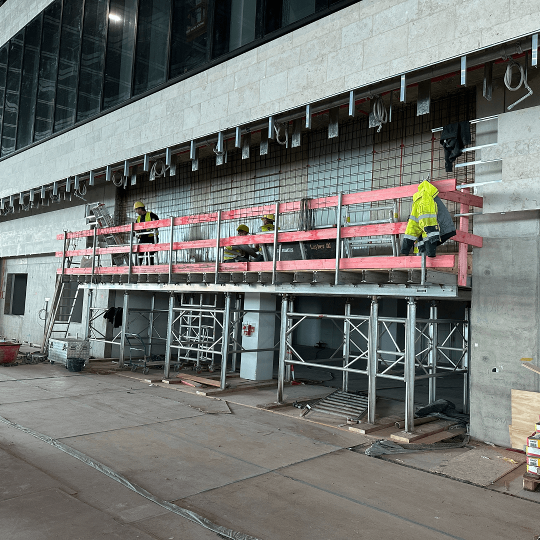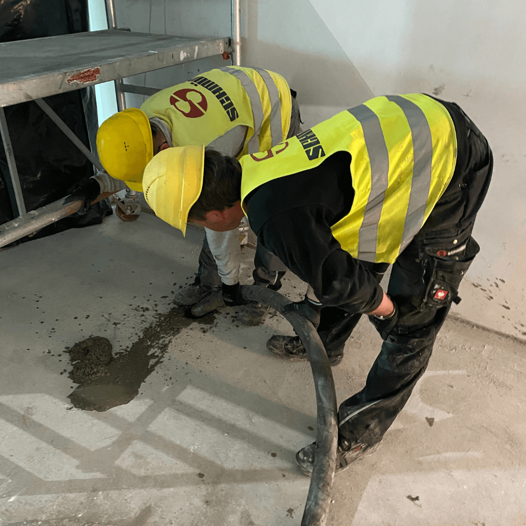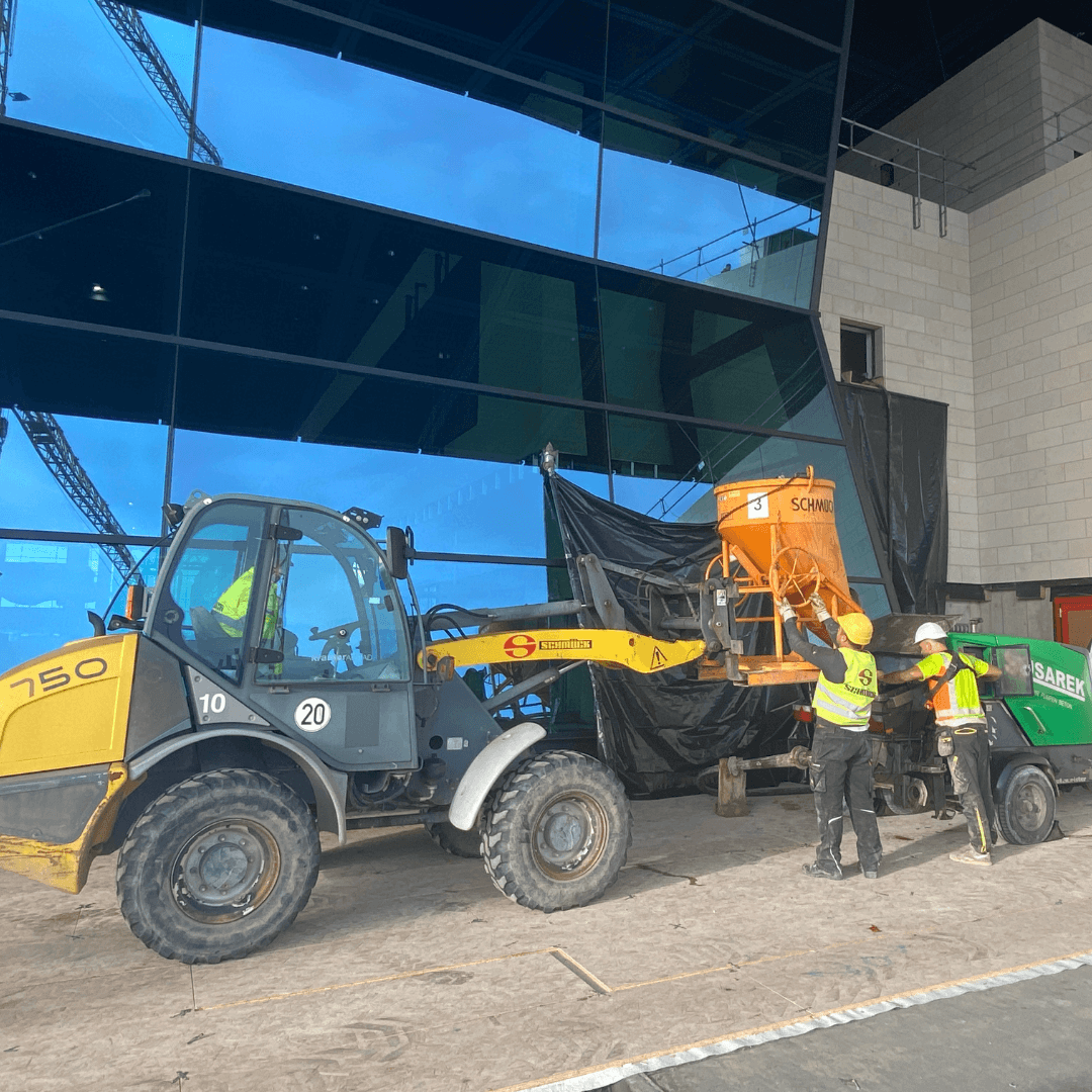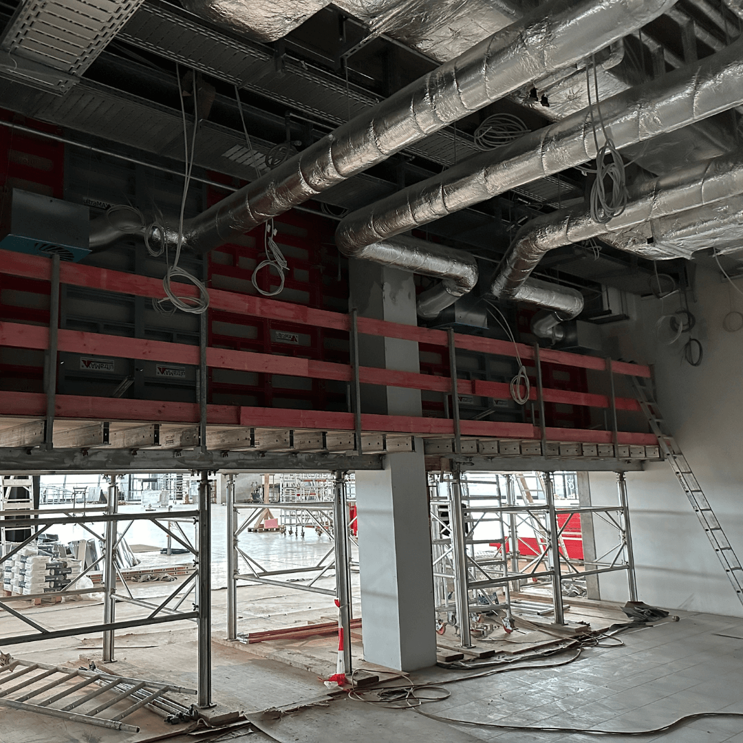 Um den zulassungskonformen Einbau eines Brandschutztores zu gewährleisten, musste nachträglich in den bereits fortgeschrittenen Gebäudeausbau ein Stahlbetonunterzug, der ausschließlich mittels Bewehrungsanschlüssen an der Decke abgehangen wurde, eingebaut werden. Die Einbringung des Betons erfolgte über Ø100mm Kernbohrungen in der Decke. Besonders herausfordernd gestaltete sich bei dieser Aufgabenstellung die Betonförderung mittels unter anderem 130m Schlauchleitung quer durch das Gebäude bis zum Einbauort. Um einen vollständigen Deckenanschluss zu erreichen, wurden abschließend die letzten oberen 20cm mit Vergussbeton verfüllt.