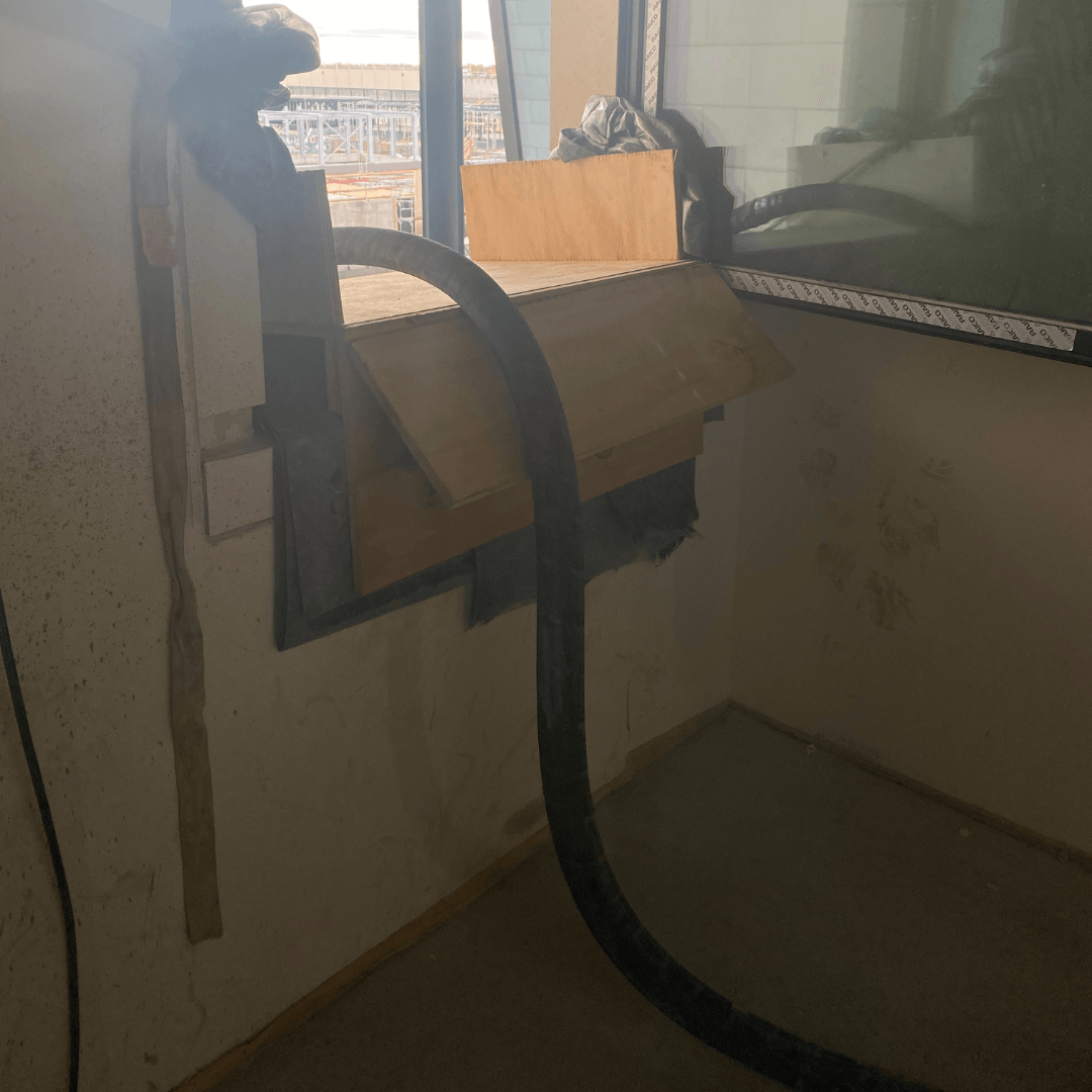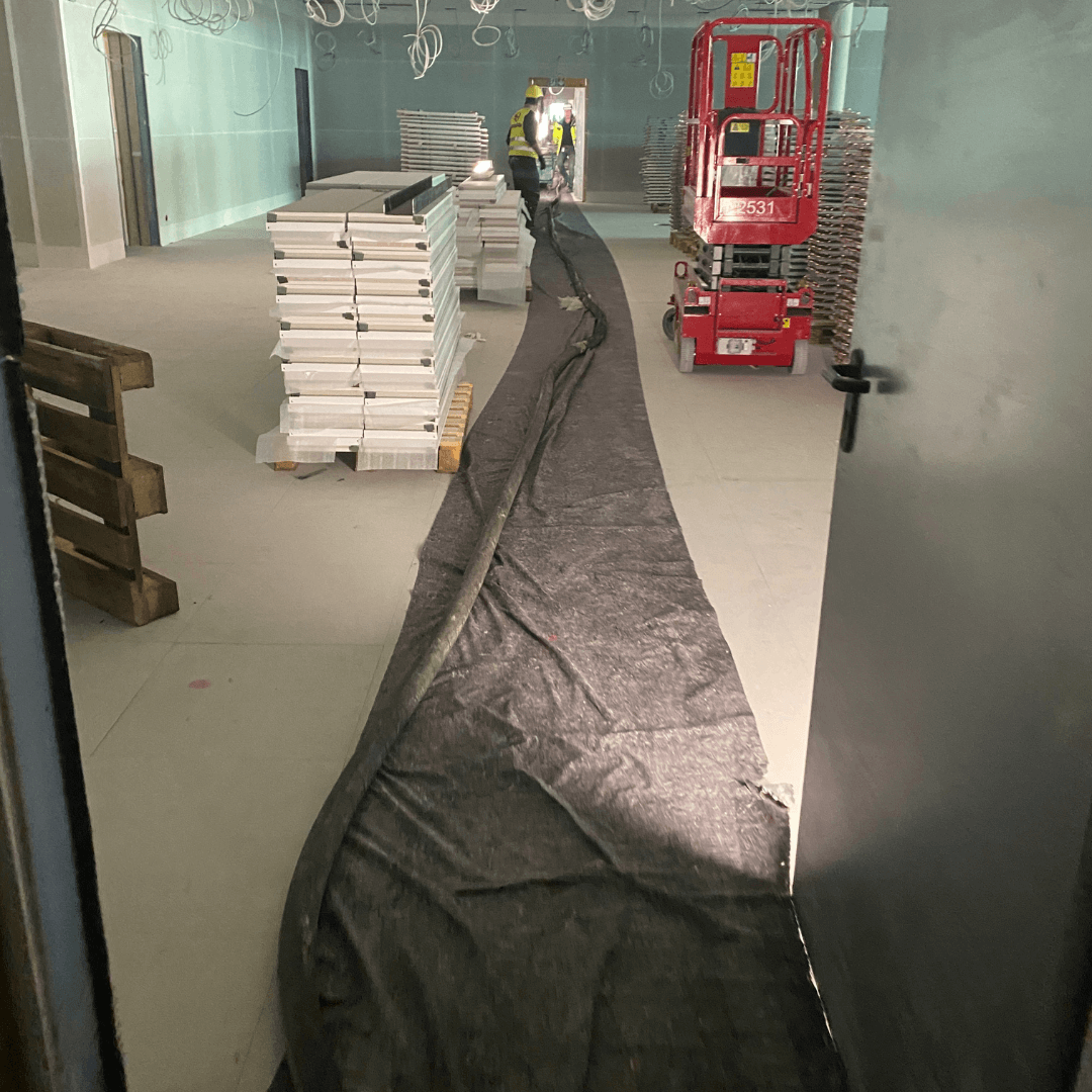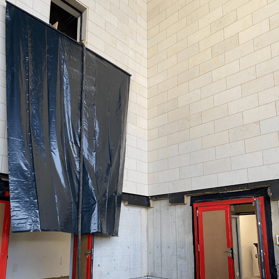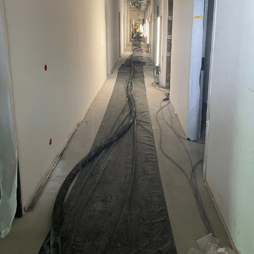 Um den zulassungskonformen Einbau eines Brandschutztores zu gewährleisten, musste nachträglich in den bereits fortgeschrittenen Gebäudeausbau ein Stahlbetonunterzug, der ausschließlich mittels Bewehrungsanschlüssen an der Decke abgehangen wurde, eingebaut werden. Die Einbringung des Betons erfolgte über Ø100mm Kernbohrungen in der Decke. Besonders herausfordernd gestaltete sich bei dieser Aufgabenstellung die Betonförderung mittels unter anderem 130m Schlauchleitung quer durch das Gebäude bis zum Einbauort. Um einen vollständigen Deckenanschluss zu erreichen, wurden abschließend die letzten oberen 20cm mit Vergussbeton verfüllt.